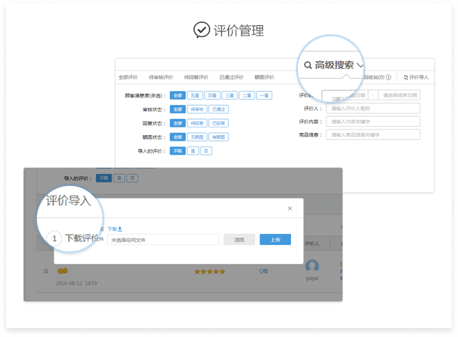 待审核评价、待回复评价、已通过评价、晒图评价、评价导入、批量删除评价、高级搜索评价、回收站